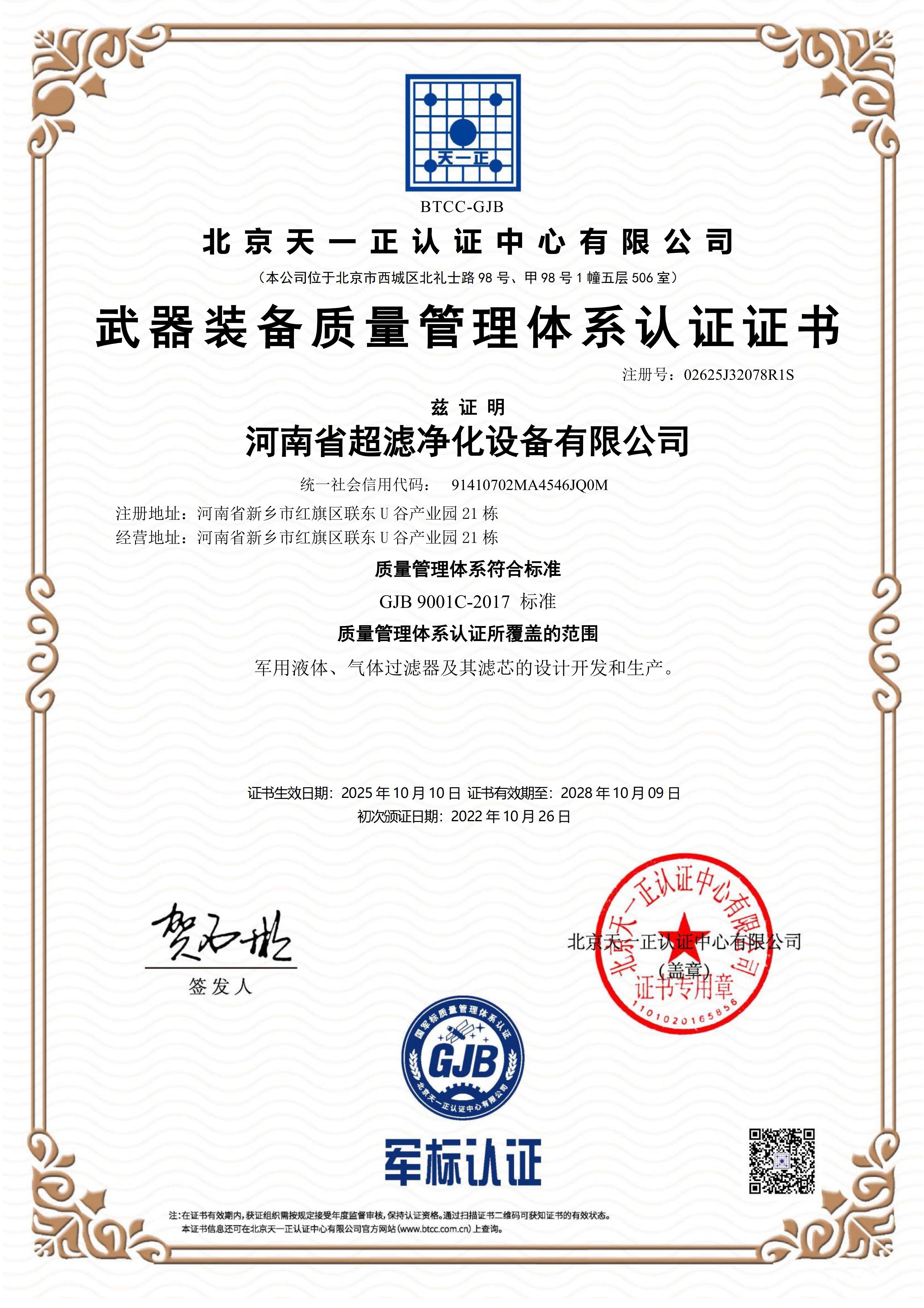公司是过滤与分离行业协会会员单位,秉承“以质量求生存,靠创新谋发展”的指导思想,始终把产品质量放在前位,不断进取,持续改进,精益求精,按照ISO9001标准建立了一套完善的质量保证管理体系,2022年通过了国 军标《GJB9001C-2017》质量体系认证,使公司的产品质量得到提升,也将规范公司的管理,为客户提供更多的、稳定的高品质产品。